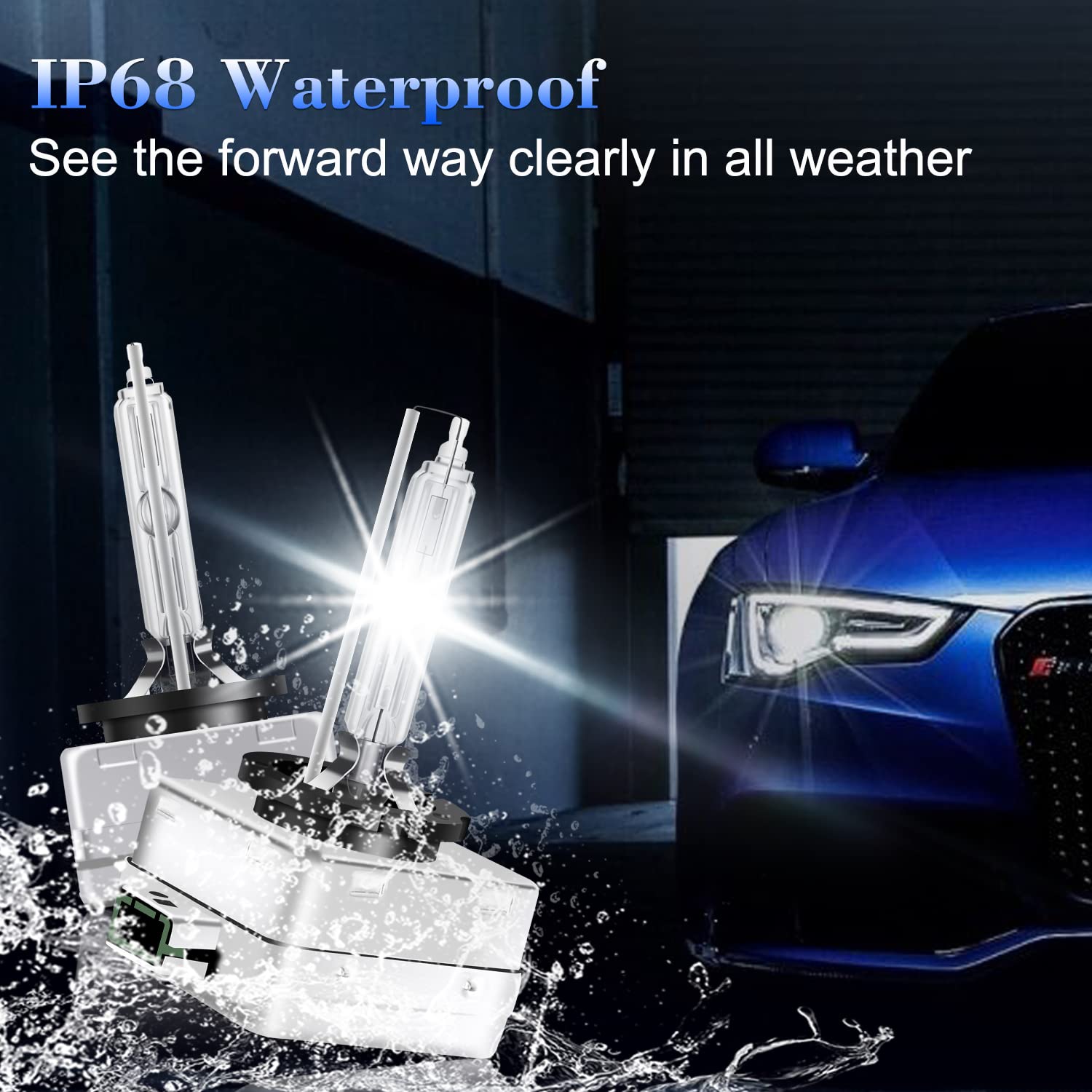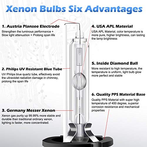 The beam pattern more focused , no dark areas and This xenon Bulbs is fit for D3S Bulbs. Diamond White 6000k light with hint of blue won't sting your eyes. Brightest visibility and safety for the road.