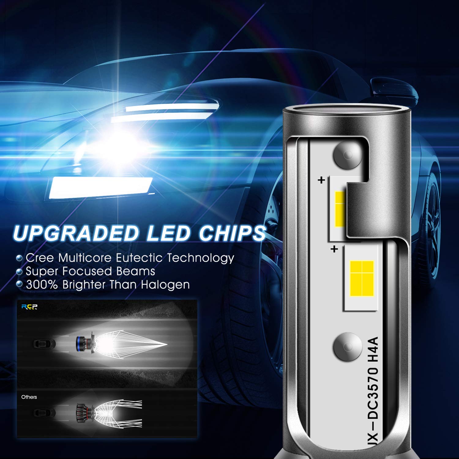 This H4 LED headlamp bulb, made from upgraded CREE LED chips, 7000lm and 70W a pair (3500lm and 35W per bulb), is more focused in light and perfect in beam pattern without dark spots. 6000K bright white light is similar with the daylight which improves visibility for everything that lies ahead of you.