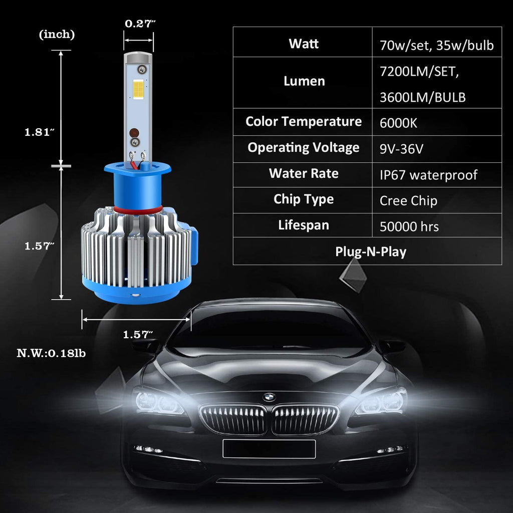 - H1 led headlight bulbs, Super bright and energy-efficient Turbo bulbs with 70W per pair (35W Per bulb), 7200LM LED bright light. 6000K cool white lighting 200% brighter than Halogen headlights.